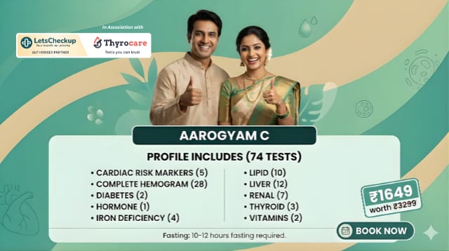 Prioritize your well-being with the Aarogyam C health checkup – a complete package covering 74 essential tests for a thorough health assessment.